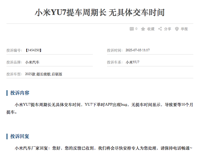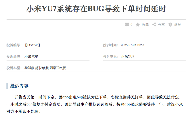 此外,小米汽车旗下全新车型——小米YU7因“定(订)金纠纷;不按时交车”被投诉至榜单第九名,投诉量为95起。简单来说,小米YU7被投诉并非出现质量问题,而是是集中在服务问题,主要体现在车辆交付延期,不给退订金等。据一名2025款超长续航四驱Pro版本车主表示:“开售当天第一时间下定,因app出现bug被认为已下单,实际查询并无订单,因此导致无法付定,一小时之后bug修复才付定成功,导致生产排期远远落后,按照app显示需要等待一年。”另一名2025款超长续航后驱版车主也表示:“小米YU7提车周期长无具体交车时间,YU7下单时APP出现bug,无提车时间显示,导致要等10个月提车。”