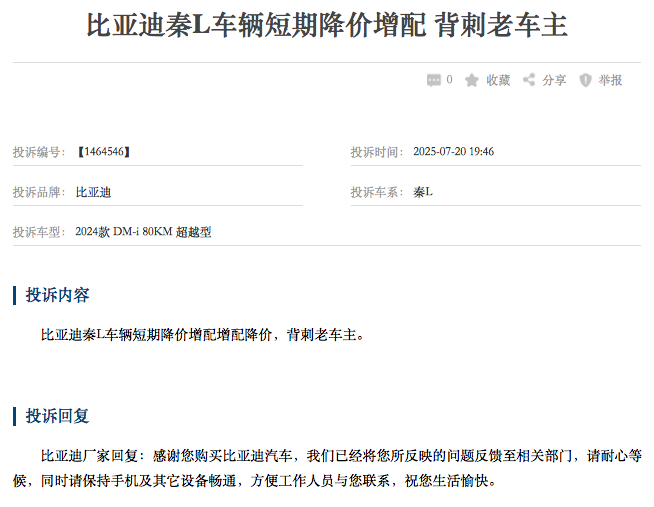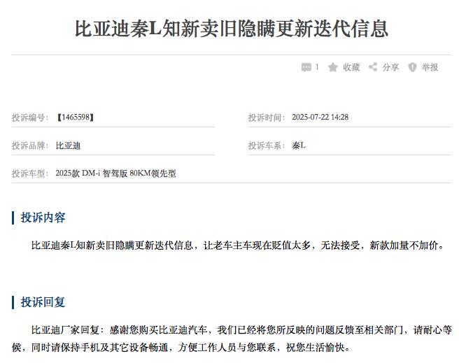 比亚迪旗下秦L因为“新旧款迭代纠纷;续航里程不准”被投诉至榜单第八名,投诉量为100起。一名2025款DM-i 智驾版80KM领先型版本的车主表示:“比亚迪秦L知新卖旧隐瞒更新迭代信息,让老车主车现在贬值太多,无法接受,新款加量不质加价。”另一名2024款DM-i 80KM 超越型版本的车主也表示:“比亚迪秦L车辆短期降价增配、增配降价,背刺老车主。”