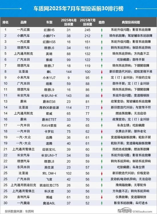从“2025年7月车型投诉TOP30排行榜”显示的来看,7月上榜前十名的车企包括一汽红旗、小鹏汽车、理想汽车、上汽通用别克、广汽本田、比亚迪、小米汽车。其中,一汽红旗、理想汽车、广汽本田三家车企均有两款车型被投诉至榜单前十名。